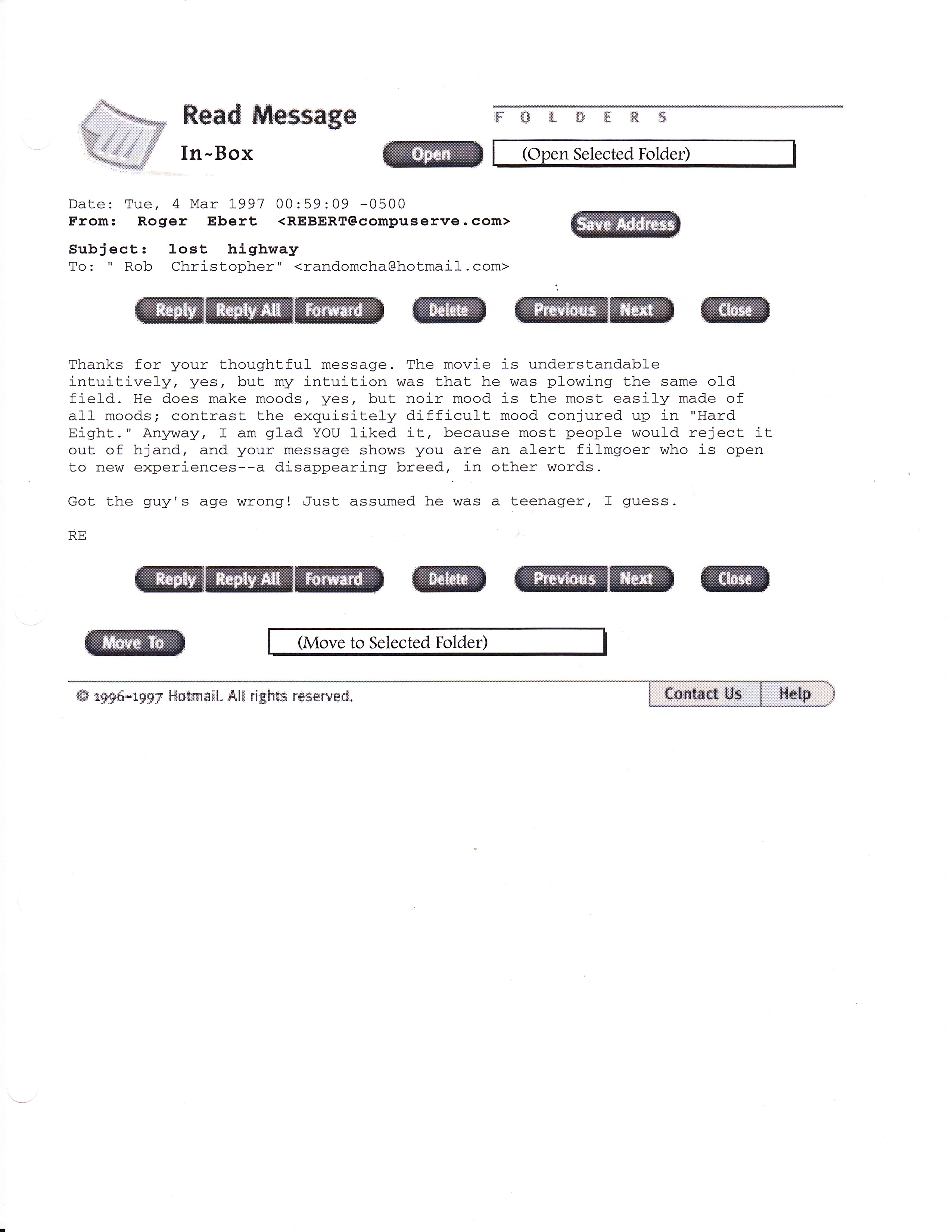 Good thing I printed this out! I was 21 when I emailed him, taking him to task for panning Lost Highway. In his original review he wrote that Pete Dayton (Balthazar Getty’s character) was in high school. I rather haughtily corrected him; yet in his reply he’s gracious and even breezy. The fact that he’d take the time and effort to reply to a crank like me just shows how generous he could be.